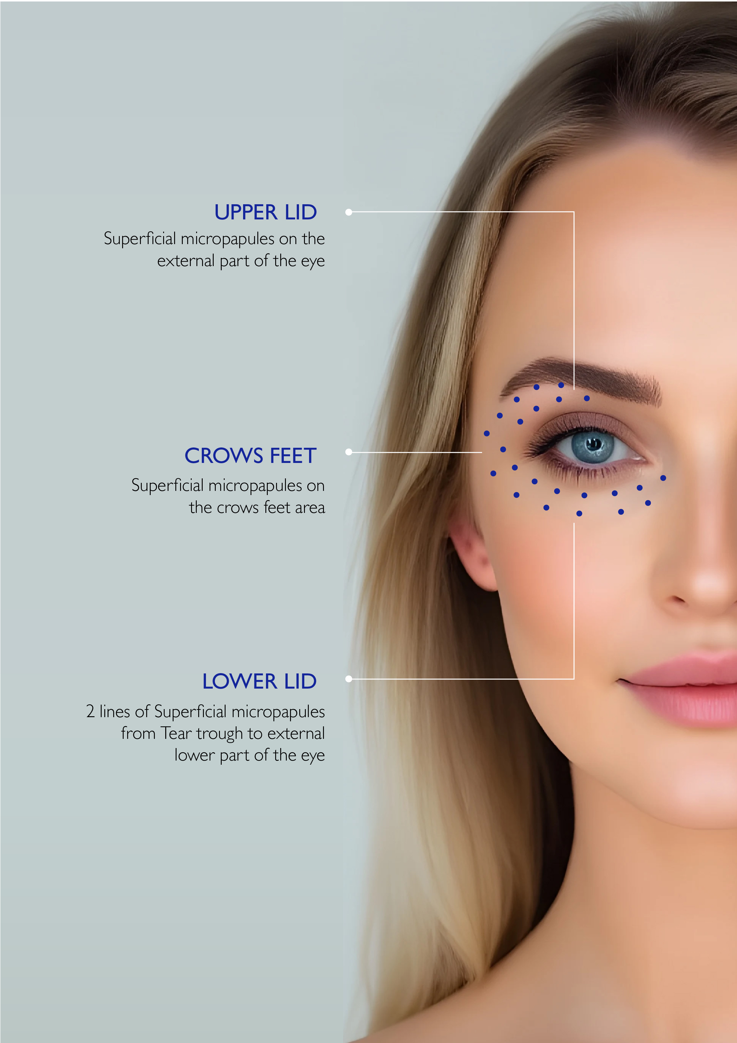 Microinjections placed across the periorbital area to activate hydration and brighten the skin.